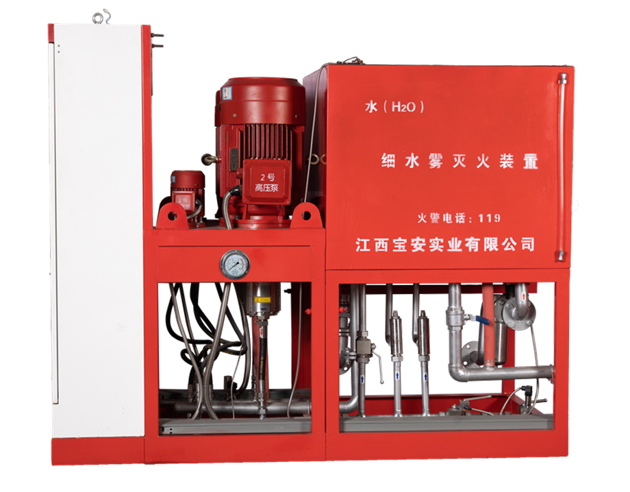 细水雾灭火装置由高压细水雾专用储水箱、细水雾灭火装置泵组单元(包括高压主泵、高压备泵、稳压泵、泵组单元控制柜、进水电磁阀、进水过滤器、调节水箱等)、补水系统、供水管网、细水雾灭火装置分区控制阀箱组、细水雾喷头、高压细水雾管道及火灾探测报警系统等组成。