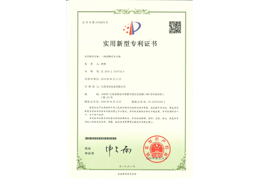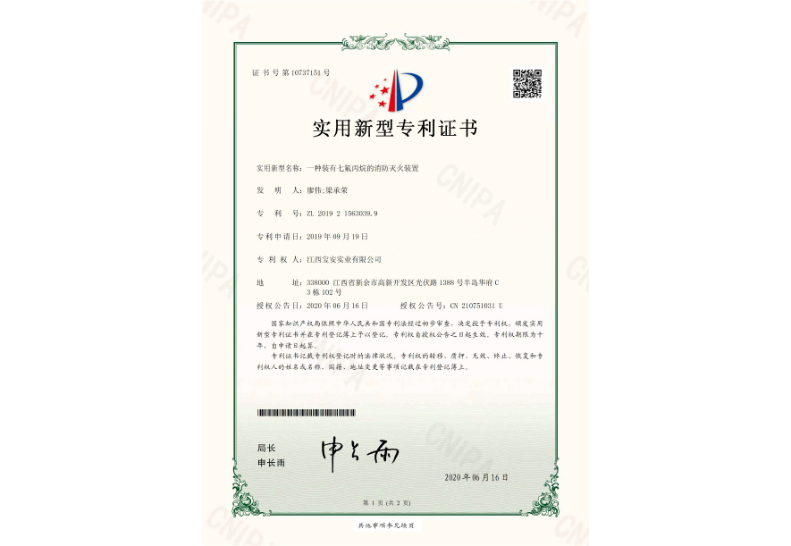 一种装有七氟丙烷的消防灭火装置-实用新型专利证书(签章)